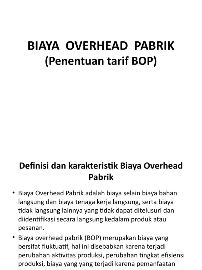 Biaya overhead termasuk komponen biaya yang cukup berpengaruh dan tidak berkaitan langsung pada proses produksi walaupun adanya suatu produk dan jasa. Overhead pabrik mengacu pada biaya yang dikeluarkan untuk menjalankan divisi manufaktur perusahaan anda. Misalnya seperti beban penyusutan gedung pabrik yang didistribusikan ke departemen produksi. Dapat dikatakan, biaya overhead pabrik yaitu besaran dana untuk keperluan penunjang proses produksi. Tarif biaya overhead pabrik (bop) dalam menetapkan besarnya bop yang dibebankan pada produk suatu perusahaan didasarkan pada tariff yang sudah ditentukan di awal. Pada dasarnya, biaya overhead pabrik … Di dalam perusahaan, terdapat berbagai jenis biaya dikeluarkan, overhead cost atau biaya overhead adalah salah satunya. Biaya overhead pabrik merupakan pengeluaran perusahaan terhadap kebutuhan manufaktur dan secara tidak langsung berkaitan dengan hasil produksi. Biaya overhead pabrik disebut juga biaya konversi … Biaya overhead adalah salah satu jenis risiko produksi yang wajib anda perhitungkan. Misalnya, biaya ketika pemakaian bahan tambahan,. Jadi, berikut ini adalah contoh biaya overhead pabrik. Ini pengertian, cara menghitung dan meminimalisirnya.
